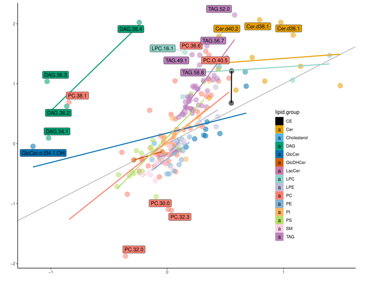 Lipid analysis is performed by reversed phase liquid chromatography coupled to a cutting edge high-resolution Orbitrap Mass Spectrometer. Performed semi-quantitative analysis for several lipid classes, referring to one isotopically-labeled internal standard per class