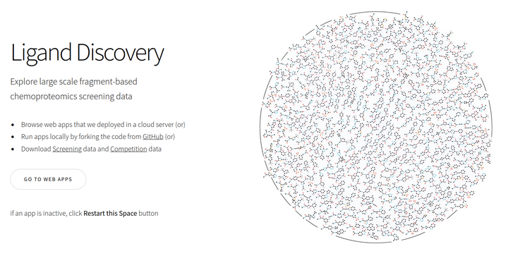 Explore the interactions between ligands and proteins. This is the main navigator to the chemoproteomics data, containing profiles for 407 fragments. The app also showcases competition assays for a few selected fragments