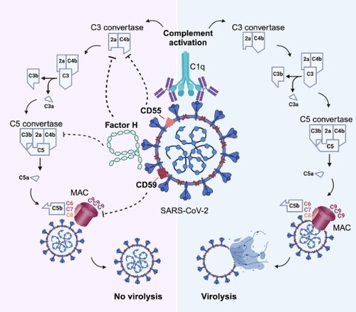 Comparision of Complement Activation with and without Virolysis © AuthorsThe complement system is a vital anti-microbial defence mechanism against circulating pathogens. Excessive complement activation can have deleterious outcomes for the host and is consequently tightly modulated by a set of membrane-associated and fluid-phase regulators of complement activation (RCAs). Here, we demonstrate that severe acute respiratory syndrome coronavirus 2 (SARS-CoV-2) hijacks host cellular RCA members CD55 and CD59 and serum-derived Factor H (FH) to resist antibody-dependent complement-mediated lysis triggered by immunized human sera. Blockage of the biological functions of virion-associated CD55 and CD59 and competition of FH recruitment with functionally inactive recombinant FH-derived short consensus repeats SCR18-20 restore SARS-CoV-2 complement sensitivity in a synergistic manner. Moreover, complement-mediated virolysis is dependent on classical pathway activation and does not occur in the absence of virus-specific antibodies. Altogether, our findings present an intriguing immune escape mechanism that provides novel insights into the immunopathology observed in severe coronavirus disease 2019 (COVID-19).