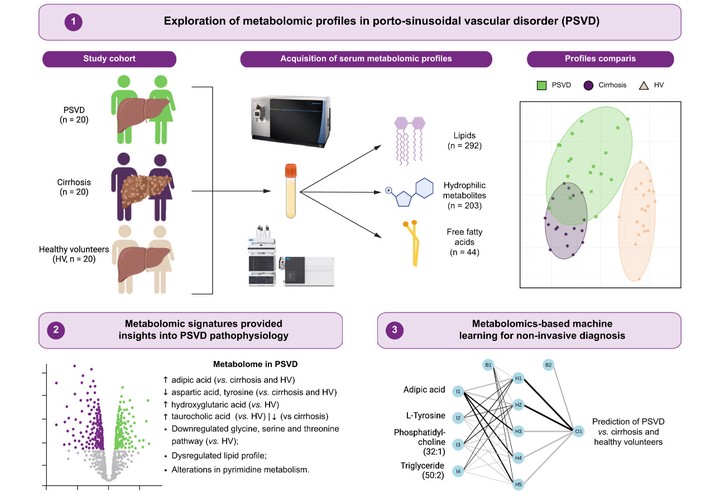 Porto-sinusoidal vascular disorder (PSVD) is a vascular liver disease that can lead to pre-sinusoidal portal hypertension in the absence of cirrhosis, with poorly understood pathophysiology and no established treatment. Our study demonstrates that analyzing the serum metabolome could reveal distinct metabolic signatures in patients with PSVD, including alterations in the pyrimidine, glycine, serine and threonine pathways, potentially shedding light on the disease’s underlying pathways. These findings could enable earlier and non-invasive diagnosis of PSVD, potentially reducing reliance on invasive procedures like liver biopsy and guiding diagnostic pathways.